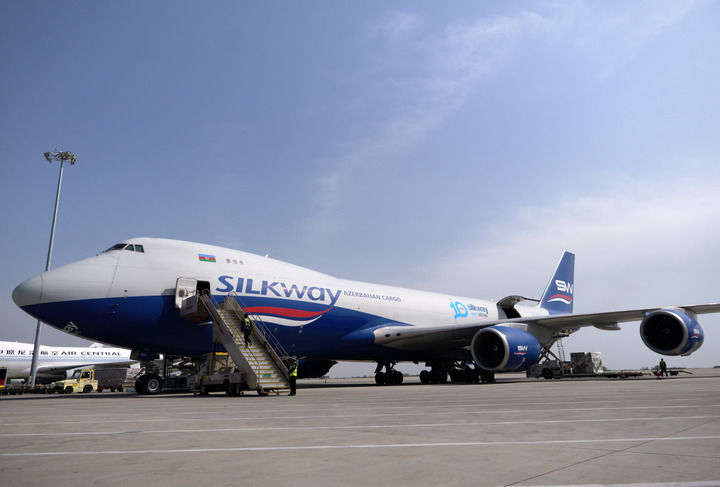 一架阿塞拜疆丝绸之路西部航空公司的货机停靠在郑州新郑国际机场停机坪上。