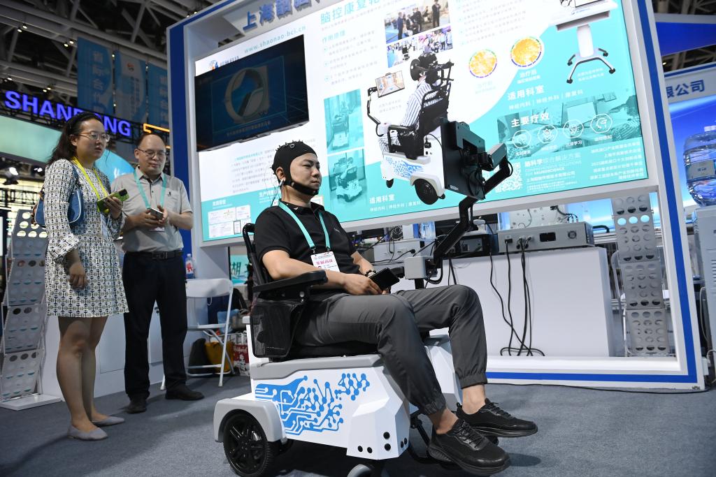 在第九届丝绸之路国际博览会暨中国东西部合作与投资贸易洽谈会省际合作展上海市展区,工作人员演示脑控康复轮椅。