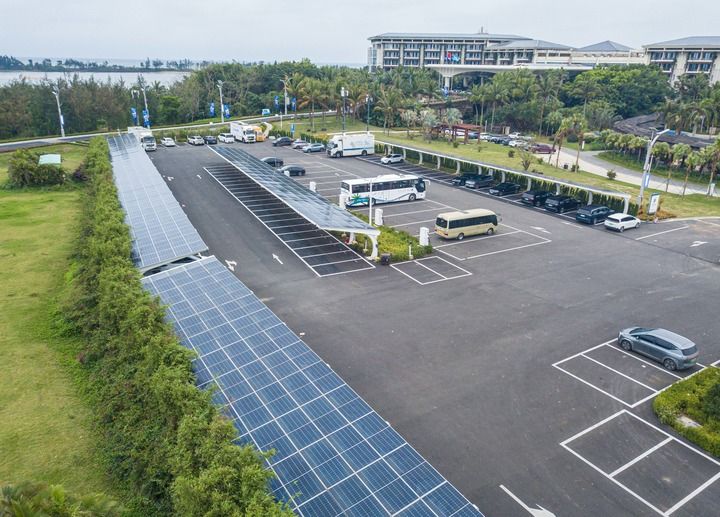 在海南博鳌零碳示范区拍摄的建有光伏发电设备的停车场。