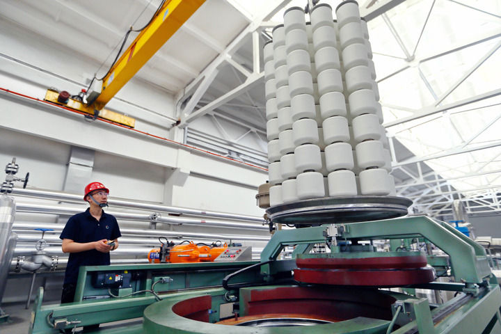 在青岛市即墨区即发集团股份有限公司超临界二氧化碳无水染色生产线上,工人将一批待染的聚酯纤维筒子纱装入染缸。