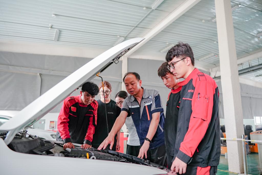 在新疆和田技师学院,北京援疆教师李宝(右三)和当地教师一同指导学生维修汽车。