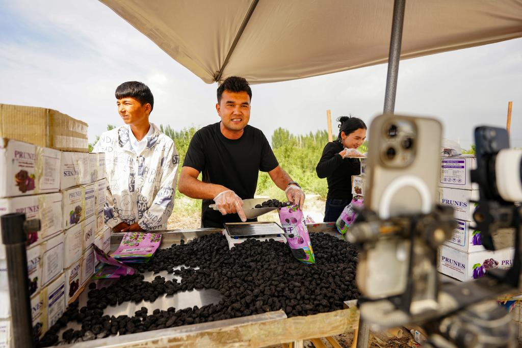 在新疆阿克苏市新疆红旗坡农贸物流园,“95后”电商米尔扎提·卡米力在直播带货当地农产品。