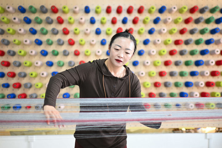 在青海省果洛藏族自治州玛沁县久美家园的“沪沁怡”氆氇手工编织坊内,工作人员卓玛杰在梳经,该工坊由上海援青团队打造。