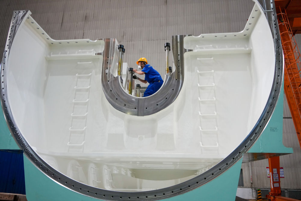 “这是全球首台使用零碳氨燃料的船用发动机,不久后,它将成为一艘21万吨巨型散货船的‘绿色心脏’。”在山东青岛中船集团中船发动机有限公司生产车间,公司技术与信息中心副主任工程师祖象欢指着一台约五层楼高的船舶发动机说。
