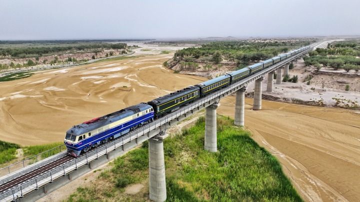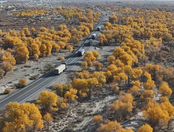 截至目前,环塔克拉玛干沙漠周缘,G314国道(乌鲁木齐至红其拉甫段)等一条条现代化公路与10余个民用机场已经织成一张网络,将这片沙海环绕其中。而新疆和若铁路的开通运营,则完成世界首条环沙漠铁路“最后一块拼图”,让上千万各族群众受益。