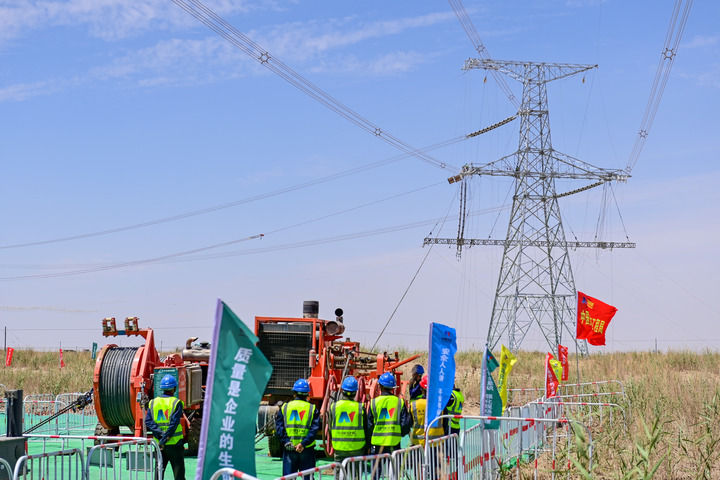 7月13日,在塔克拉玛干沙漠南缘,最后一段电线被轰鸣着的牵引机拽着,从183号铁塔出发,掠过和若铁路和国道315线,最终牢牢锚定在188号铁塔上。