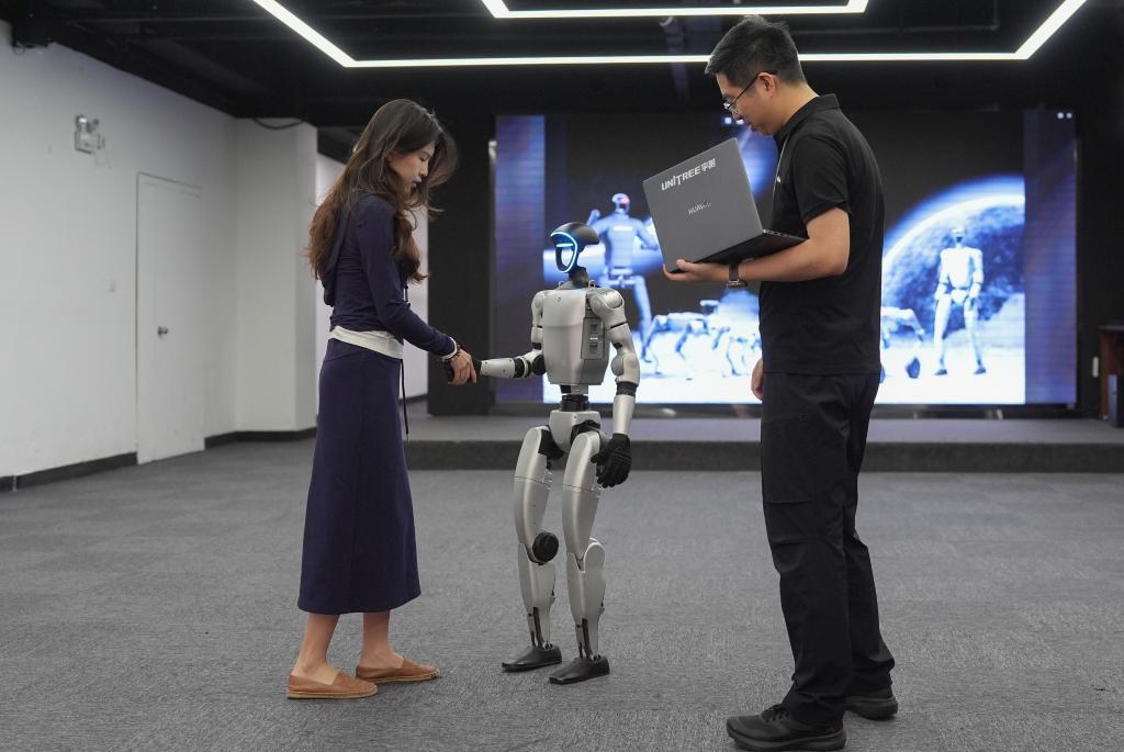 在知名机器人公司杭州宇树科技展厅内,宇树人形机器人G1展示握手动作。