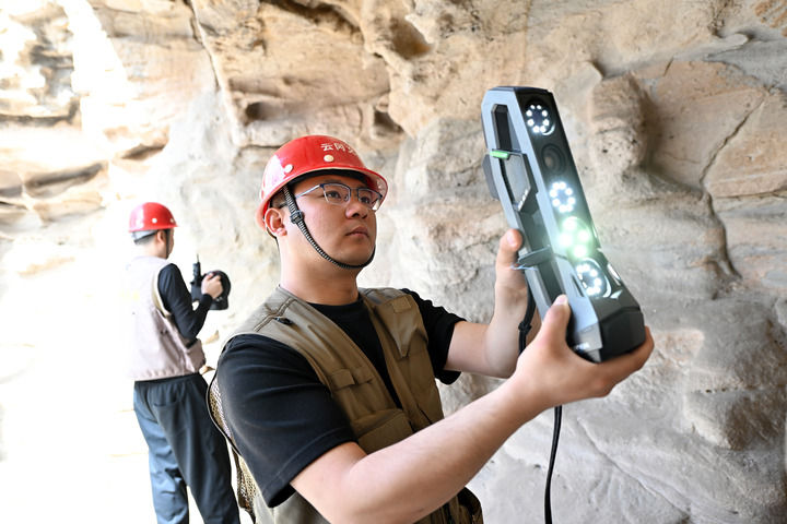 在山西大同云冈石窟,云冈研究院数字化保护中心工作人员在进行数字化信息采集。