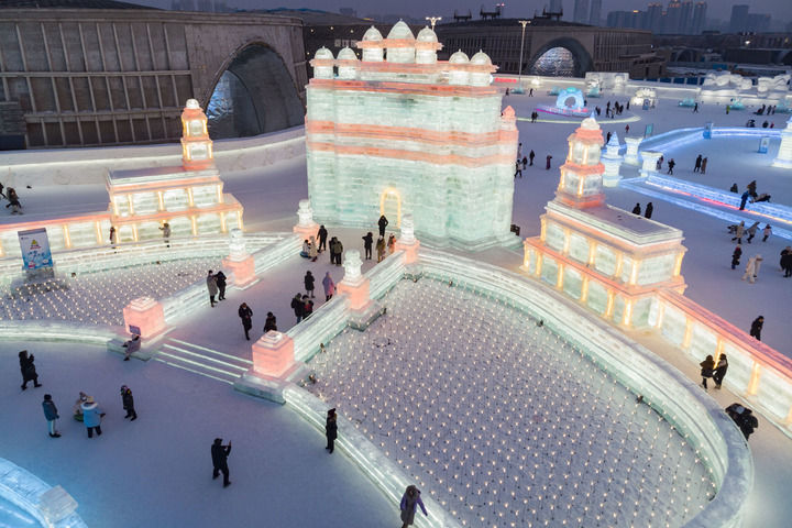 游客在哈尔滨冰雪大世界园区冰雪景观《胜利之城》周边游玩,该冰雪景观以印度的法塔赫布尔西格里城为原型设计建造。此届哈尔滨冰雪大世界将上合组织成员国的特色建筑以冰雪景观的形式呈现。
