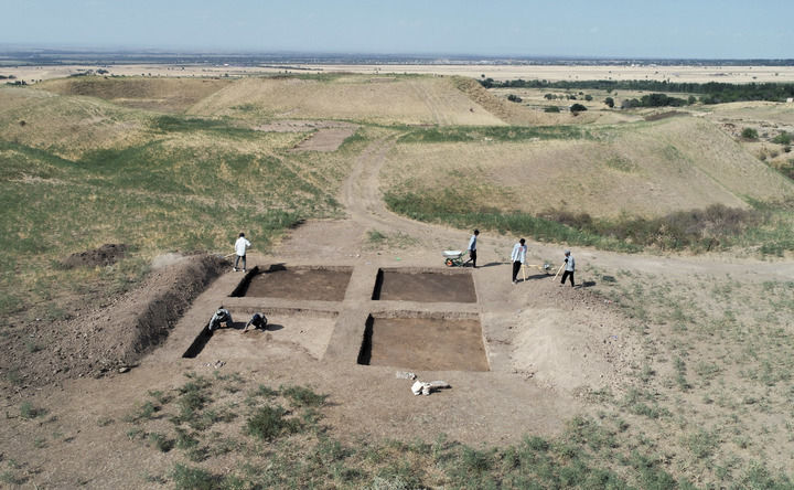 考古人员在中哈联合考古项目拉哈特遗址探方上工作。