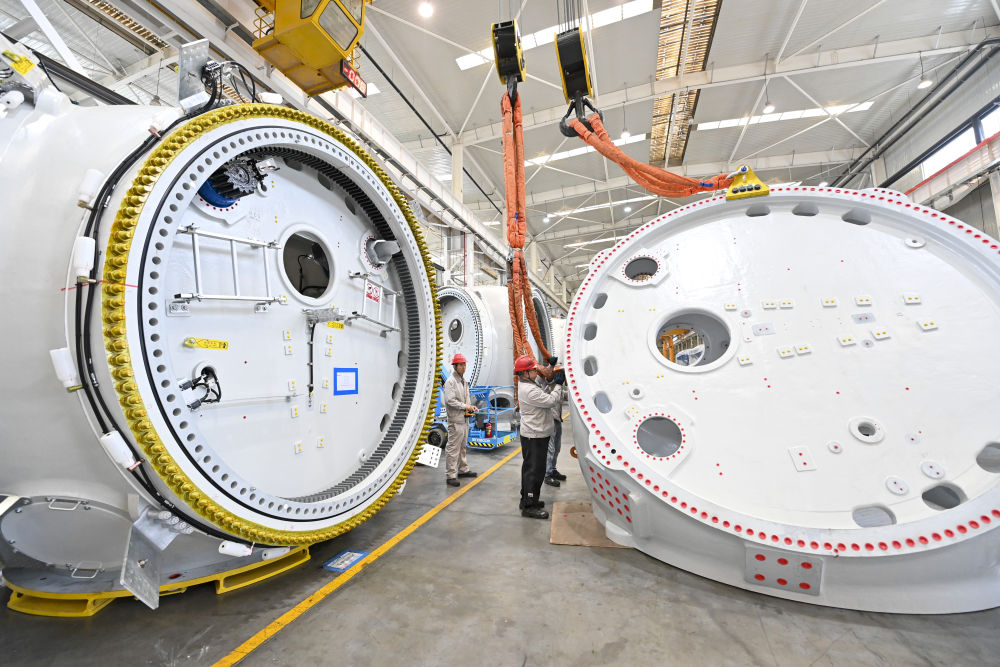 工人在位于山西转型综合改革示范区的太重集团新能源产业园区吊运风电装备。