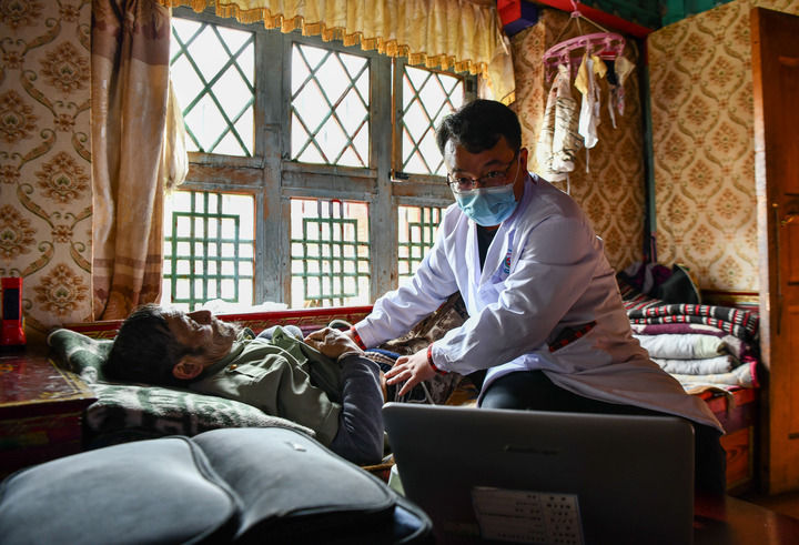 广东珠海市人民医院第七批援藏医疗队王旭彤医生在给西藏米林市吞不绒村患者珠杰检查身体。