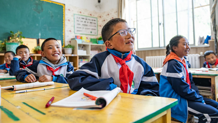 西藏林芝市工布江达县娘蒲乡中心小学五年级的学生在上课。