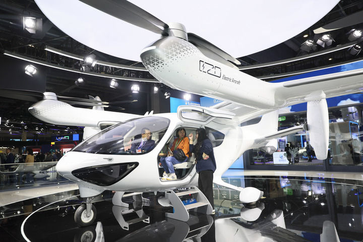 人们在第八届进博会汽车及智慧出行展区时的科技展位体验电动垂直起降飞行器。