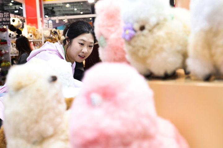 在第八届进博会消费品展区,参观者在秘鲁温暖驼品牌的羊驼毛制品前驻足观看。