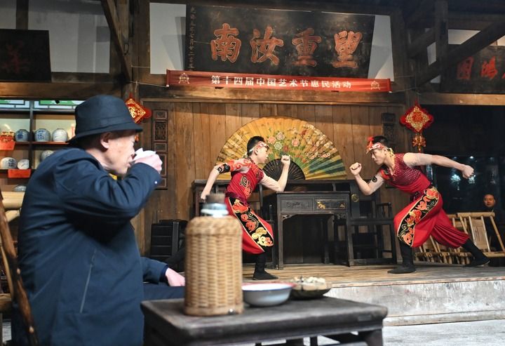 茶客在成都金琴老茶馆一边喝茶一边观看沈阳杂技演艺集团杂技演员表演的杂技节目《男子对手》,这是第十四届中国艺术节惠民活动之一。