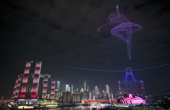 在重庆市南岸区南滨路拍摄的无人机灯光秀表演活动。