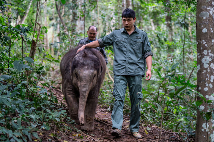 西双版纳亚洲象救护与繁育中心工作人员莫诗宇(右)、陈继铭带小象到野外开展训练。
