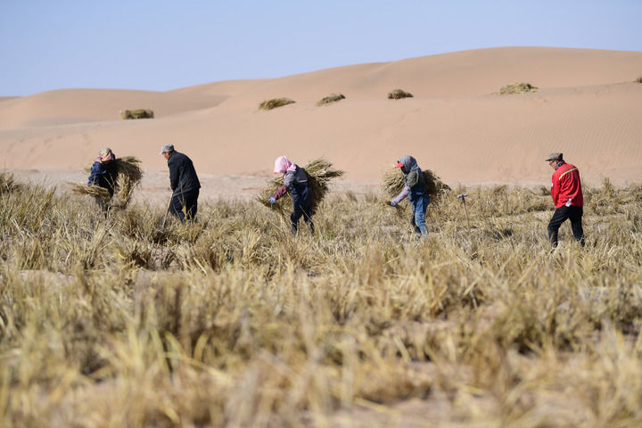 在巴丹吉林和腾格里两大沙漠交汇处的阿拉善九棵树项目区,治沙工人用稻草在沙漠中扎草方格。