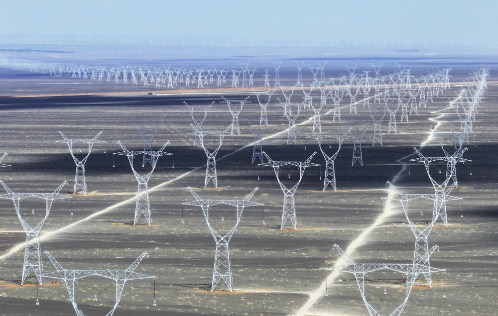 在新疆哈密地区三塘湖镇附近拍摄的“疆电入渝”特高压工程。