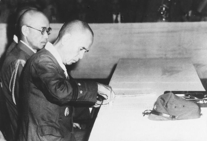 南京举行中国战区日军投降仪式,侵华日军总司令冈村宁次代表日军签署投降书。