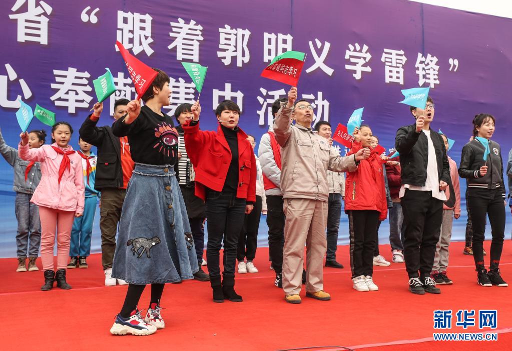 2019年3月5日,在辽宁省葫芦岛市文化广场举行的辽宁省“跟着郭明义学雷锋”爱心奉献集中活动现场,郭明义(前排中)与志愿者合唱《学习雷锋好榜样》歌曲。