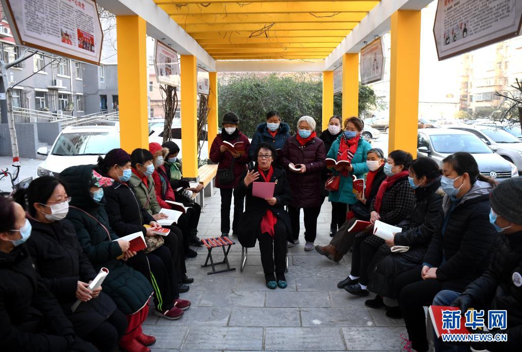 2020年12月22日,河北省石家庄市裕华区建南社区年过八十的党员靳国芳为社区居民宣讲党的十九届五中全会精神。