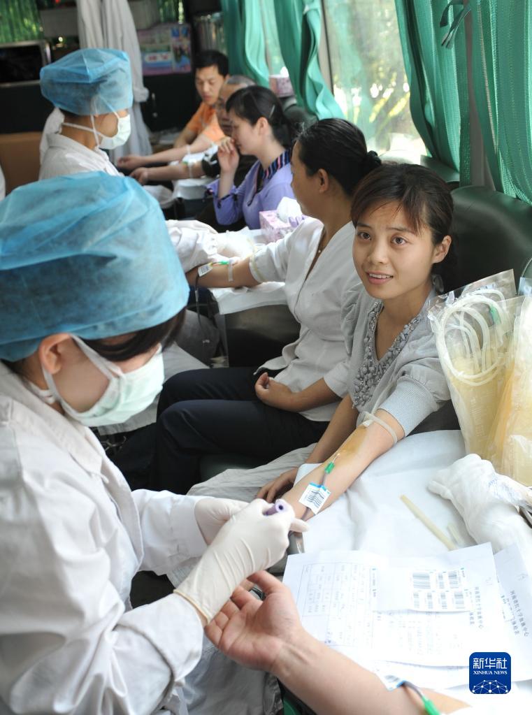 郑州市委干部肖静在流动献血车上献血(2008年5月14日摄)。2008年5月14日,数百名郑州市直机关干部职工参加援助活动,并为汶川地震灾区的受灾群众献血。