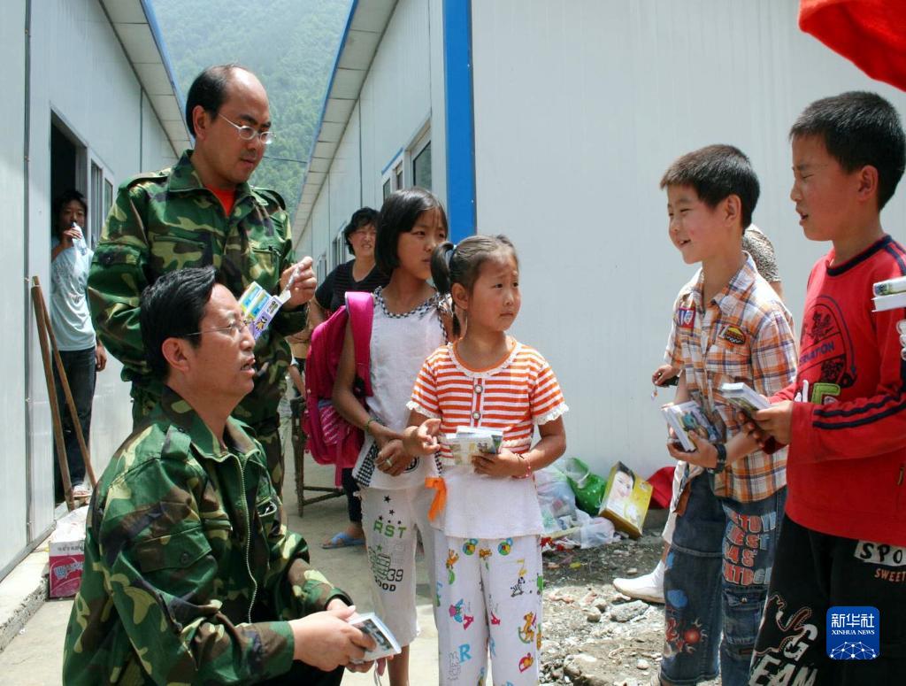 2008年“六一”儿童节当天,援川干部崔学选(前左)在北川县桂溪乡看望受灾儿童。