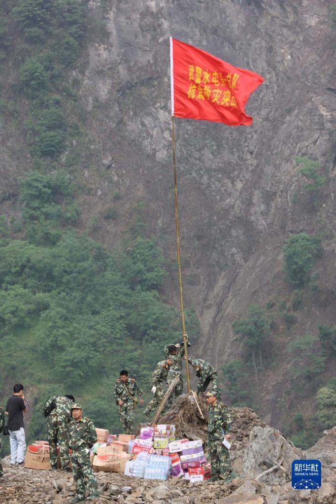 武警水电部队官兵把红旗竖起在唐家山堰塞湖抢险前沿(2008年5月26日摄)。