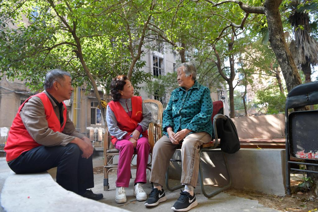 2019年11月,在江西省新余市渝水区新钢街道含笑社区,“敲门嫂”志愿服务队在社区里陪一名老人聊家常(新华社记者彭昭之 摄)