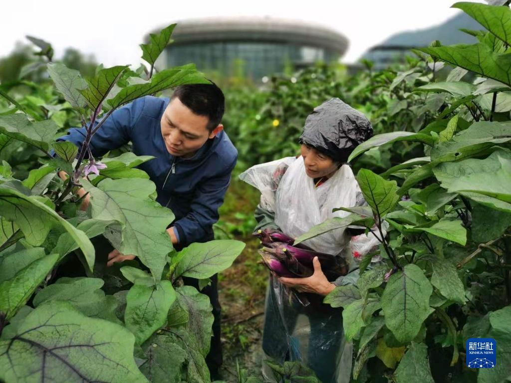 贵州省遵义市汇川区驻村干部余永流(左)和农户一起采摘茄子(资料照片)。