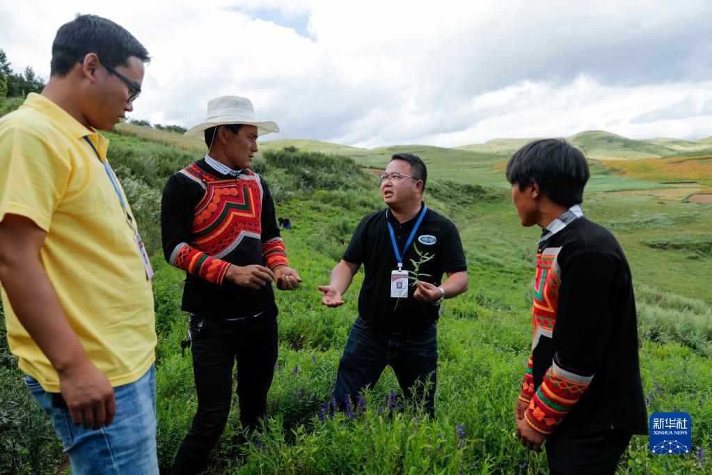 在位于四川省凉山彝族自治州昭觉县龙沟乡境内黄芩种植基地,西南医科大学副教授夏纪毅(右二)和该校派出的驻村工作队员俄且莫机(左一)为当地彝族群众讲授黄芩种植和采摘技术(2020年8月14日摄)。