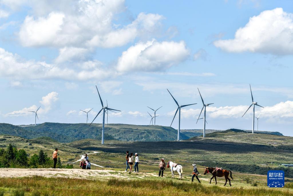 游客在贵州省龙里县龙里大草原的风电场观光(9月21日摄)。