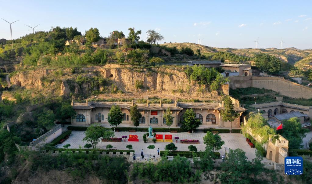 游人在陕西省榆林市米脂县杨家沟革命旧址参观(9月10日摄,无人机照片)。