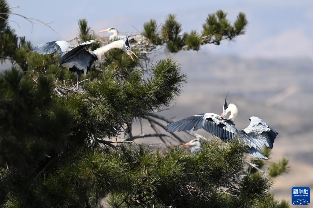 2021年3月11日,在位于吕梁山深处的山西省吕梁市方山县积翠乡,苍鹭在林间嬉戏。