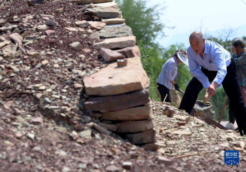 在林州市任村镇盘龙山村,王生有(前)带领村民清理乱石,维护道路(2019年7月3日摄)。