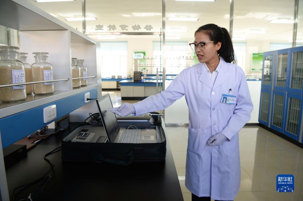 黑龙江北大荒建三江国家农业科技园区工作人员裴鑫宇在做谷物品质检测(2018年9月27日摄)。