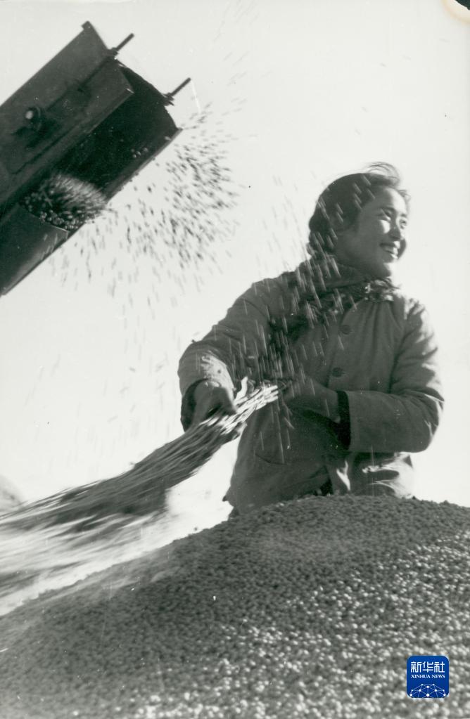 1970年,黑龙江垦区职工享受大豆丰收的喜悦(资料照片)。