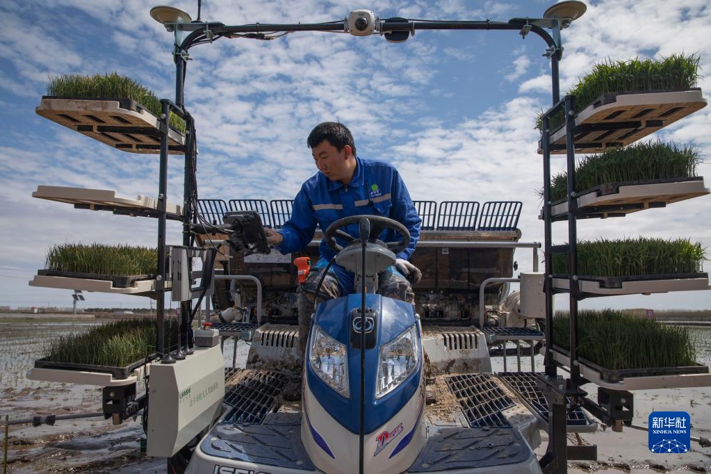 在北大荒集团红卫农场有限公司智慧农业先行示范区内,工作人员设置无人驾驶插秧机工作路径(2021年5月11日摄)。