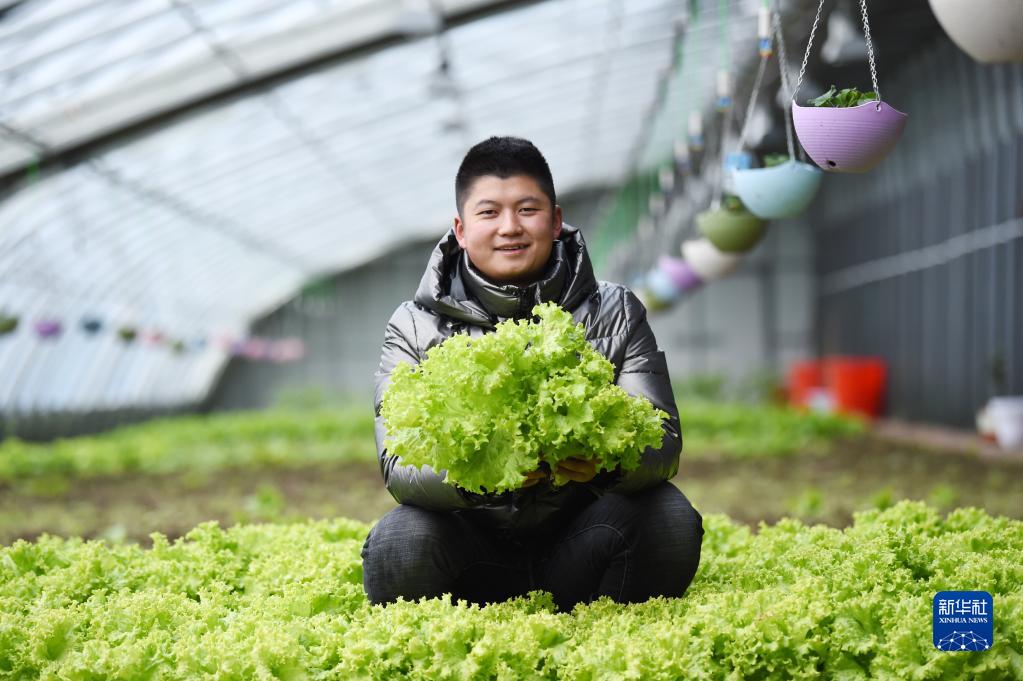 在黑龙江北大荒农垦集团双峰农场有限公司果蔬产业园区智控温室,工作人员在展示刚采摘的生菜(2021年3月5日摄)。