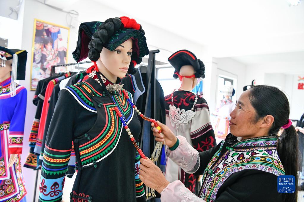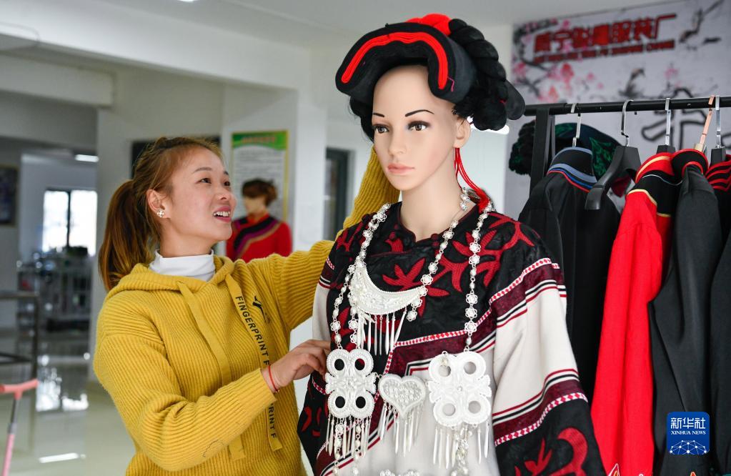 在贵州省威宁县五里岗街道朝阳新城易地扶贫搬迁安置小区,搬迁户在就业扶贫手工车间整理缝制完毕的民族服饰(11月28日摄)。