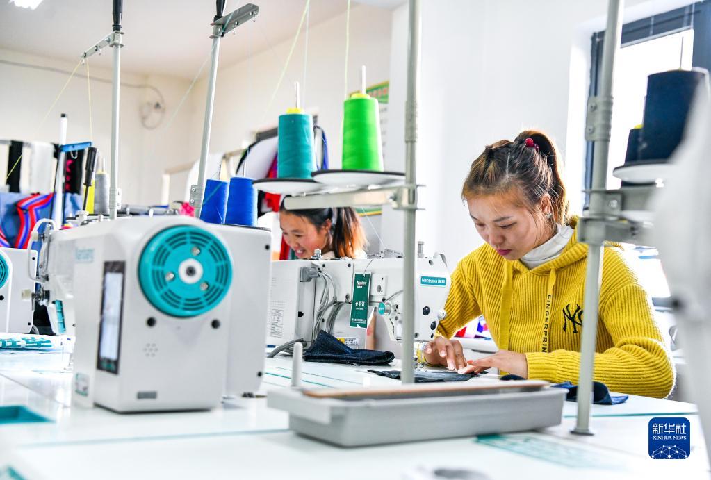 在贵州省威宁县五里岗街道朝阳新城易地扶贫搬迁安置小区,搬迁户在就业扶贫手工车间缝制民族服饰(11月28日摄)。