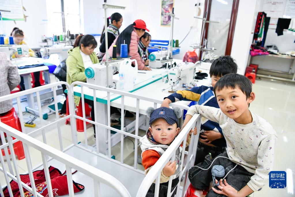 在贵州省威宁县五里岗街道朝阳新城易地扶贫搬迁安置小区,搬迁户在就业扶贫手工车间可以一边就业,一边带孩子(11月28日摄)。