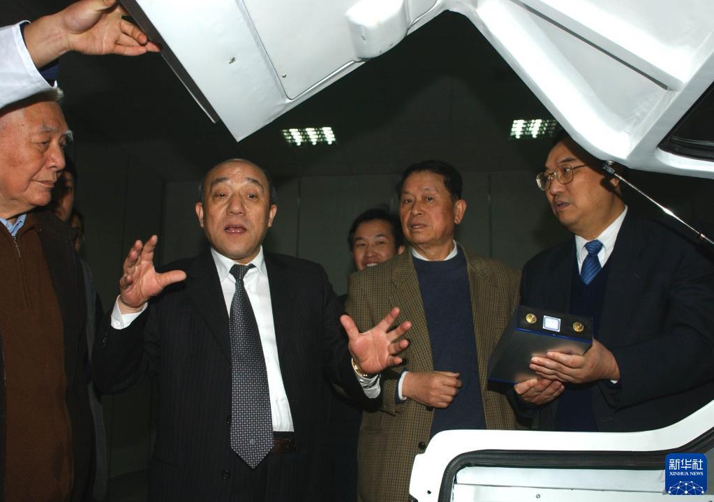 鲁冠球(左二)向参观者介绍万向集团研发电动汽车的情况(资料照片)。
