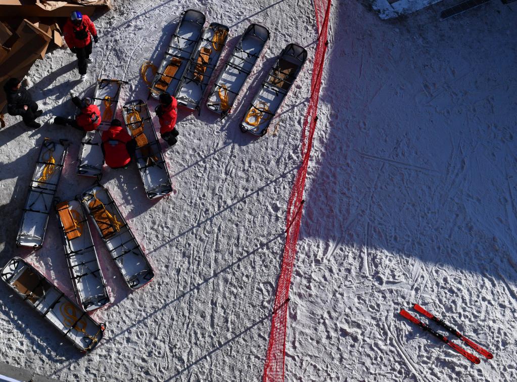 医疗救援人员在国家高山滑雪中心整理救护器材。