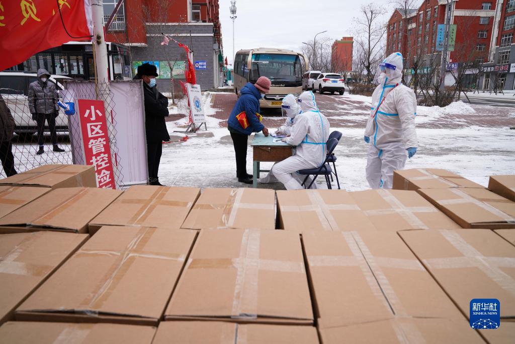 在黑龙江省黑河市爱辉区一小区,社区工作人员为居民发放免费生活物资(11月10日摄)。