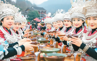 图为在贵州省黔东南苗族侗族自治州施秉县甘溪乡高碑村,苗族妇女在“2022年全国乡村村晚示范展示活动暨贵州云匠村晚”上表演苗族长桌宴敬酒歌。磨桂宾摄(人民视觉)