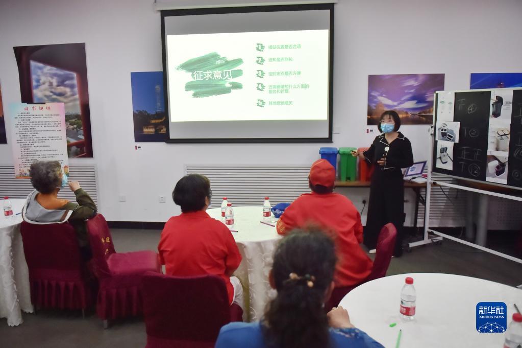 在北京建国门街道赵家楼社区议事厅举行的“两桶一袋”居民征求意见恳谈会上,来自社区的12位垃圾分类达人对“两桶”款式进行投票选择,同时,街道针对桶站位置、定时定点投放等垃圾分类运营管理听取居民意见(2020年5月2日摄)。