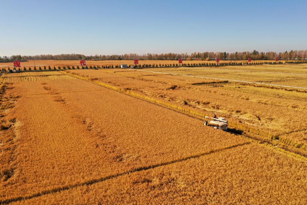 2021年10月12日,在吉林省吉林市永吉县万昌镇,农民驾驶农机收割水稻(无人机照片)。